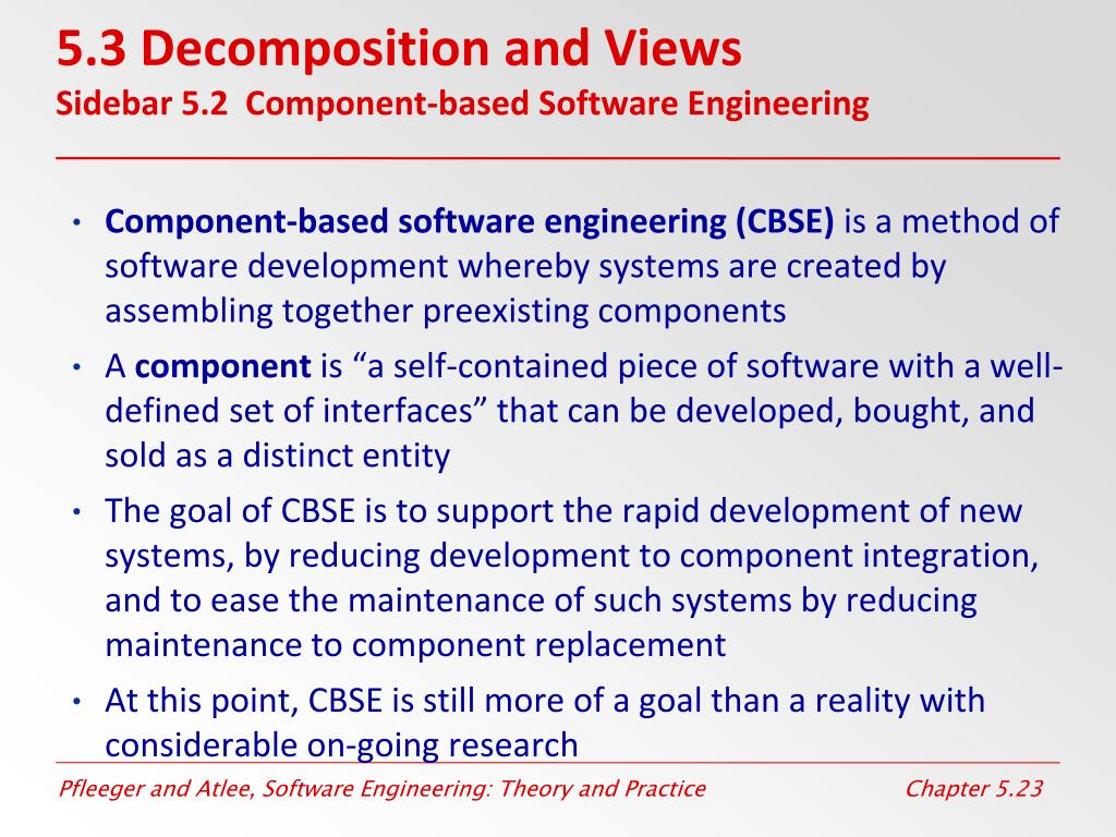 5.3 Decomposition and ViewsSidebar 5.2 Component-based Software Engineering Component-based software engineering (CBSE) is a method of software development whereby systems are created by assembling together preexisting components A component is “a self-contained piece of software with a well-defined set of interfaces” that can be developed, bought, and sold as a distinct entity The goal of CBSE is to support the rapid development of new systems, by reducing development to component integration, and to ease the maintenance of such systems by reducing maintenance to component replacement At this point, CBSE is still more of a goal than a reality with considerable on-going research