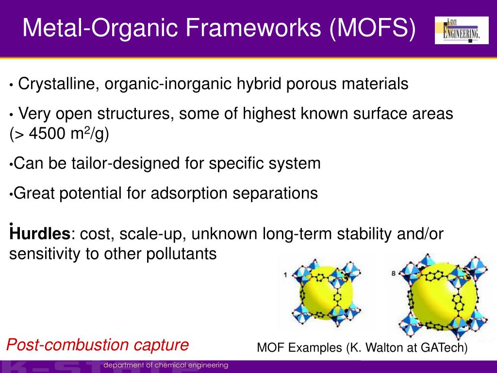 Metal-Organic Frameworks (MOFS) • Crystalline, organic-inorganic hybrid porous materials • Very open structures, some of highest known surface areas (> 4500 m2/g) • Can be tailor-designed for specific system • Great potential for adsorption separations Hurdles: cost, scale-up, unknown long-term stability and/or sensitivity to other pollutants Post-combustion capture MOF Examples (K. Walton at GATech)