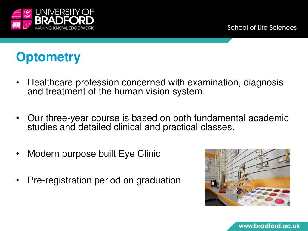 Student Profile – Aimee Rutherford Bradford has a very good reputation for Optometry. I had a look at other Universities, and Bradford was my favourite. There is the Eye Clinic, where many of our practical sessions are held with volunteer patients. There are also practice rooms which contain all of the necessary equipment needed. In the Eye Clinic we are taught how to use up to date equipment on patients and different techniques that can be carried out.