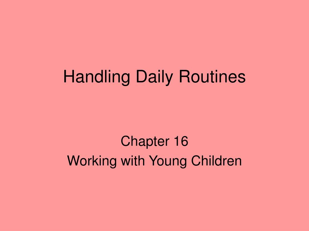 Handling Daily Routines. Chapter 16 Working with Young Children. The Daily Schedule. A well-planned schedule provide the framework for the day’s activities. The Daily Schedule. Arrival Routines Large Group Activities Self-Selected Activities Meals and Snacks Nap time. Daily Routines.