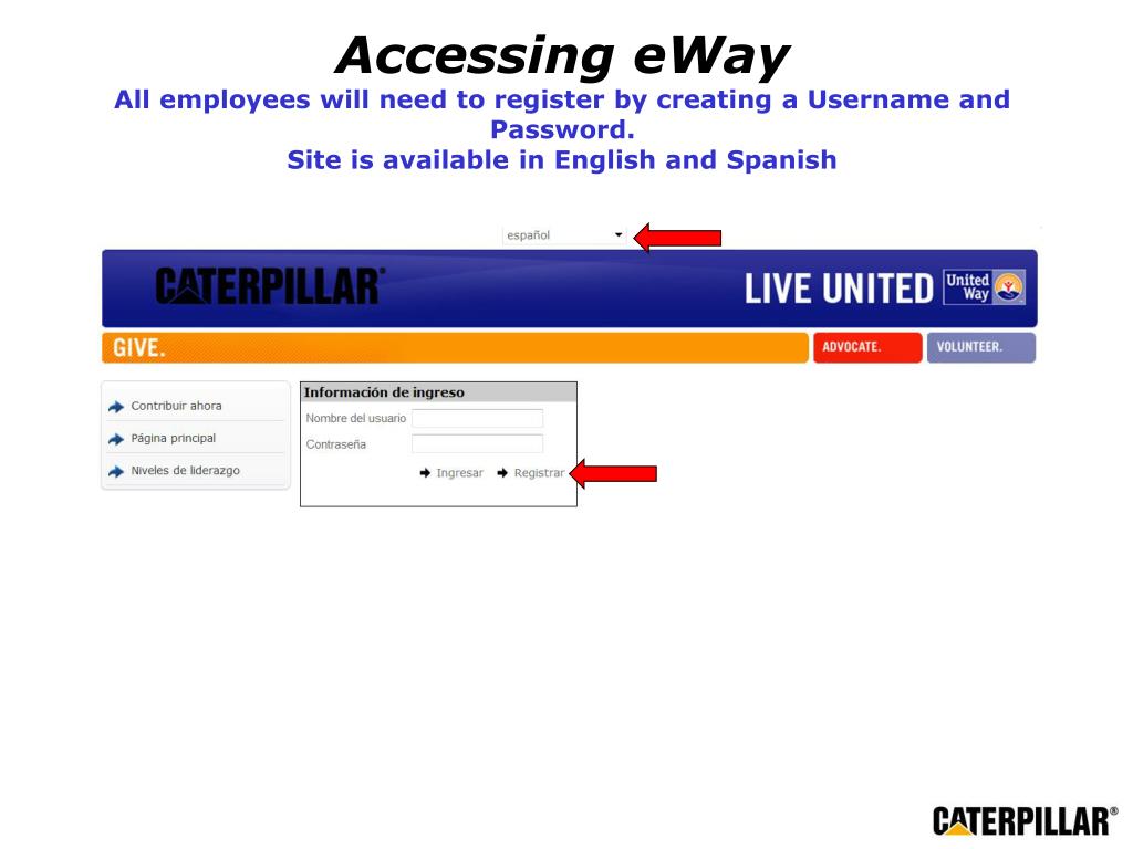 Accessing eWayAll employees will need to register by creating a Username and Password. Site is available in English and Spanish