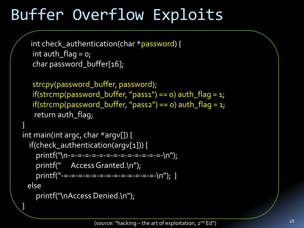 Buffer Overflow Exploits intcheck_authentication(char *password) { intauth_flag = 0; char password_buffer[16]; strcpy(password_buffer, password); if(strcmp(password_buffer, ”pass1") == 0)auth_flag= 1; if(strcmp(password_buffer, ”pass2") == 0)auth_flag= 1; return auth_flag; } intmain(intargc, char *argv[]) { if(check_authentication(argv[1])) { printf("\n-=-=-=-=-=-=-=-=-=-=-=-=-=-\n"); printf(" Access Granted.\n"); printf("-=-=-=-=-=-=-=-=-=-=-=-=-=-\n"); } else printf("\nAccess Denied.\n"); } (source: “hacking – the art of exploitation, 2nd Ed”)