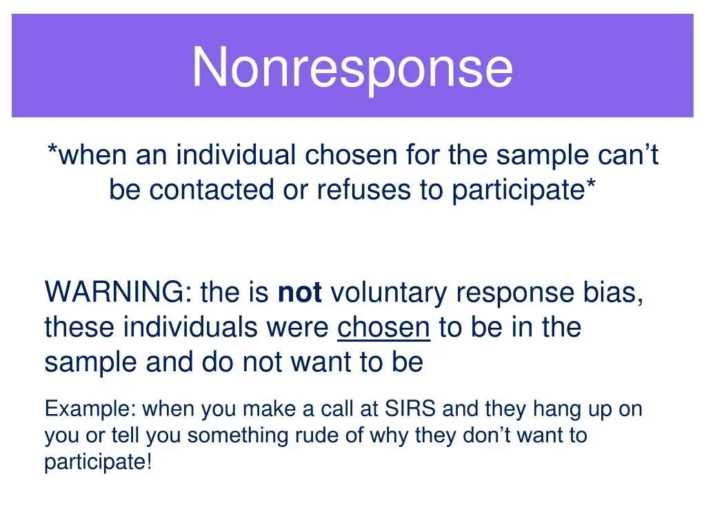 Nonresponse • *when an individual chosen for the sample can’t be contacted or refuses to participate* • WARNING: the is not voluntary response bias, these individuals were chosen to be in the sample and do not want to be • Example: when you make a call at SIRS and they hang up on you or tell you something rude of why they don’t want to participate!