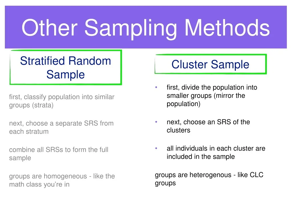 Stratified Random Sample Cluster Sample Other Sampling Methods • first, classify population into similar groups (strata) • next, choose a separate SRS from each stratum • combine all SRSs to form the full sample • groups are homogeneous - like the math class you’re in • first, divide the population into smaller groups (mirror the population) • next, choose an SRS of the clusters • all individuals in each cluster are included in the sample • groups are heterogenous - like CLC groups