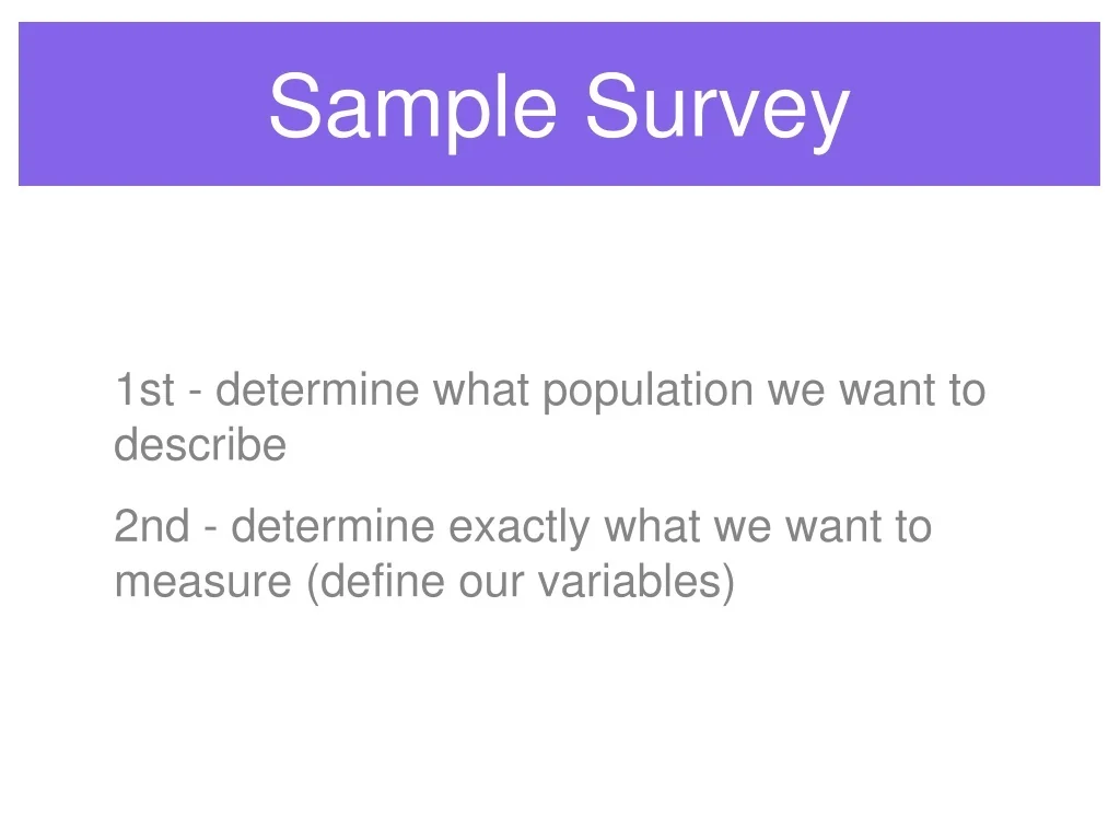 Sample Survey • 1st - determine what population we want to describe • 2nd - determine exactly what we want to measure (define our variables)