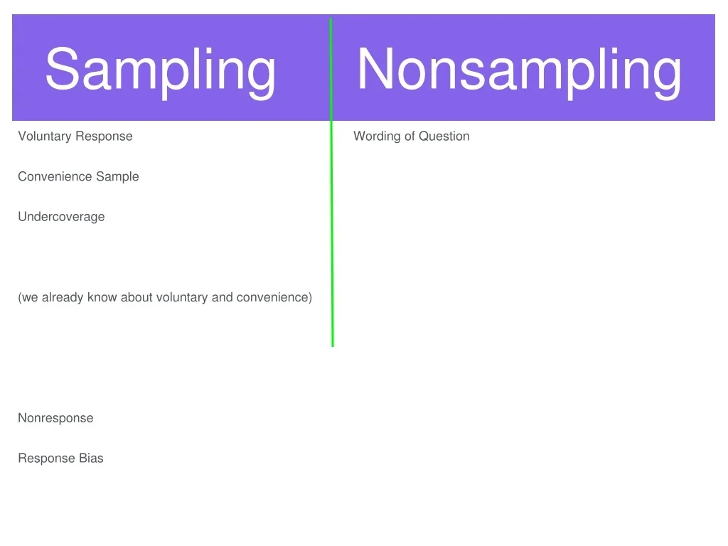 Sampling Nonsampling • Voluntary Response • Convenience Sample • Undercoverage • (we already know about voluntary and convenience) • Nonresponse • Response Bias • Wording of Question