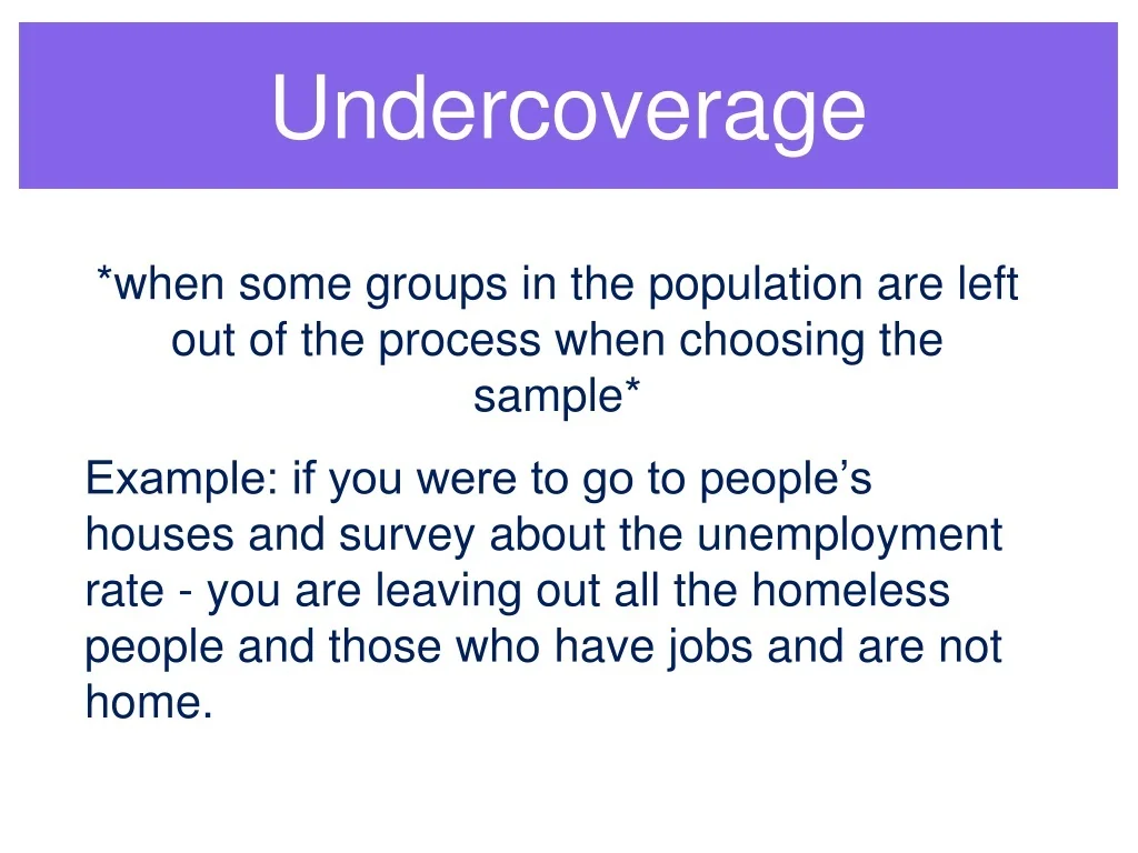 Undercoverage • *when some groups in the population are left out of the process when choosing the sample* • Example: if you were to go to people’s houses and survey about the unemployment rate - you are leaving out all the homeless people and those who have jobs and are not home.