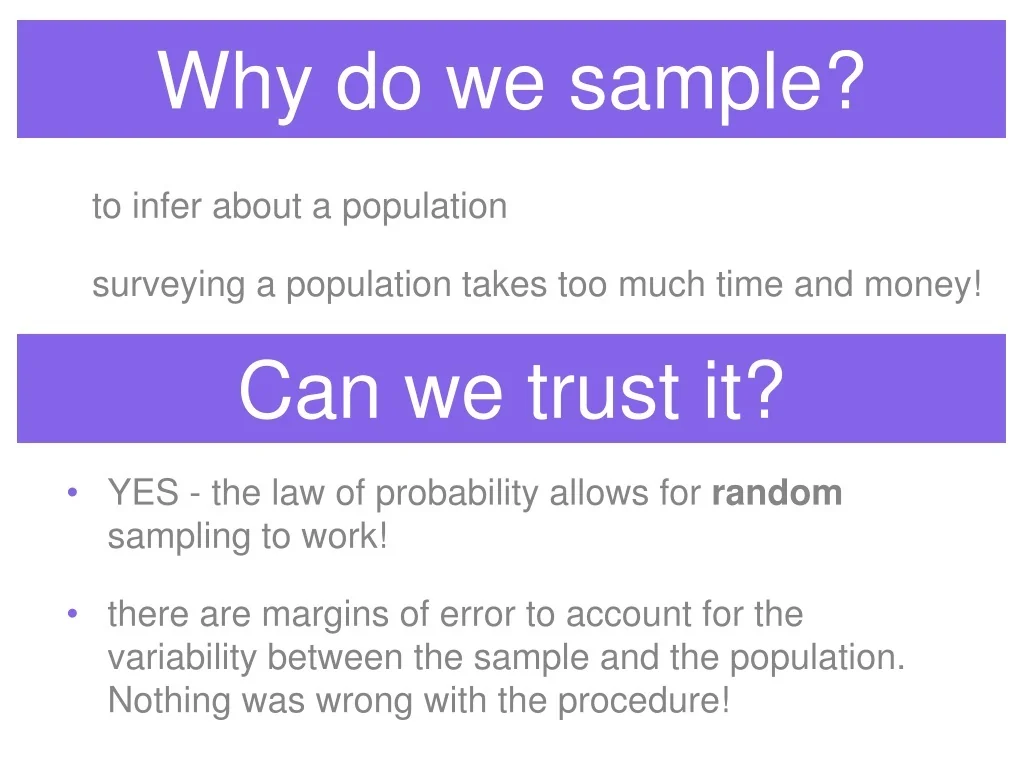 Why do we sample? • to infer about a population • surveying a population takes too much time and money! Can we trust it? • YES - the law of probability allows for random sampling to work! • there are margins of error to account for the variability between the sample and the population. Nothing was wrong with the procedure!