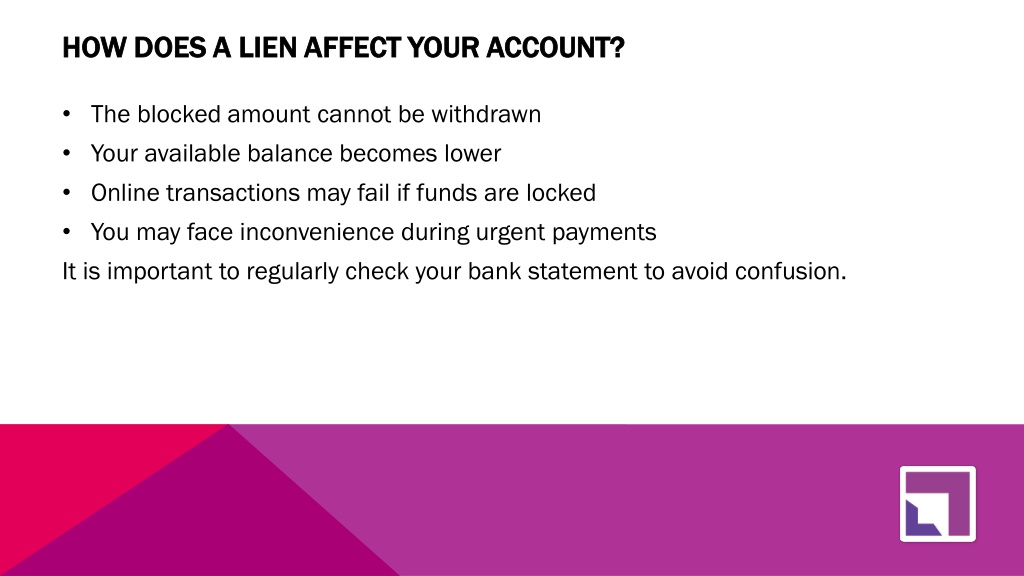 HOW DOES A LIEN AFFECT YOUR ACCOUNT? HOW DOES A LIEN AFFECT YOUR ACCOUNT? • The blocked amount cannot be withdrawn • Your available balance becomes lower • Online transactions may fail if funds are locked • You may face inconvenience during urgent payments It is important to regularly check your bank statement to avoid confusion.
