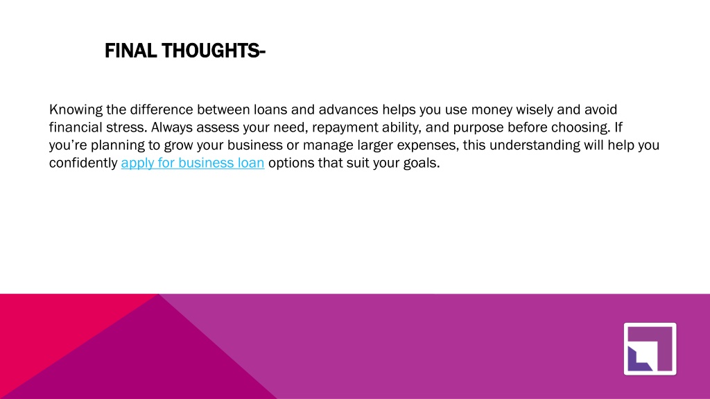 Final Thoughts- • Knowing the difference between loans and advances helps you use money wisely and avoid financial stress. Always assess your need, repayment ability, and purpose before choosing. If you’re planning to grow your business or manage larger expenses, this understanding will help you confidently apply for business loan options that suit your goals.
