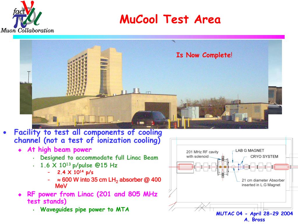 MuCool Test Area • Facility to test all components of cooling channel (not a test of ionization cooling) • At high beam power • Designed to accommodate full Linac Beam • 1.6 X 1013p/pulse @15 Hz • 2.4 X 1014 p/s • » 600 W into 35 cm LH2 absorber @ 400 MeV • RF power from Linac (201 and 805 MHz test stands) • Waveguides pipe power to MTA Is Now Complete!