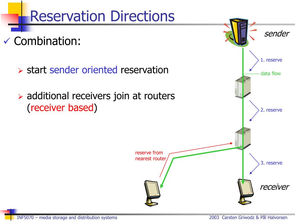Reservation Directions sender • Sender oriented: • sender (initiates reservation) • must know target addresses (participants) • in-scalable • good security 1. reserve data flow 2. reserve 3. reserve receiver