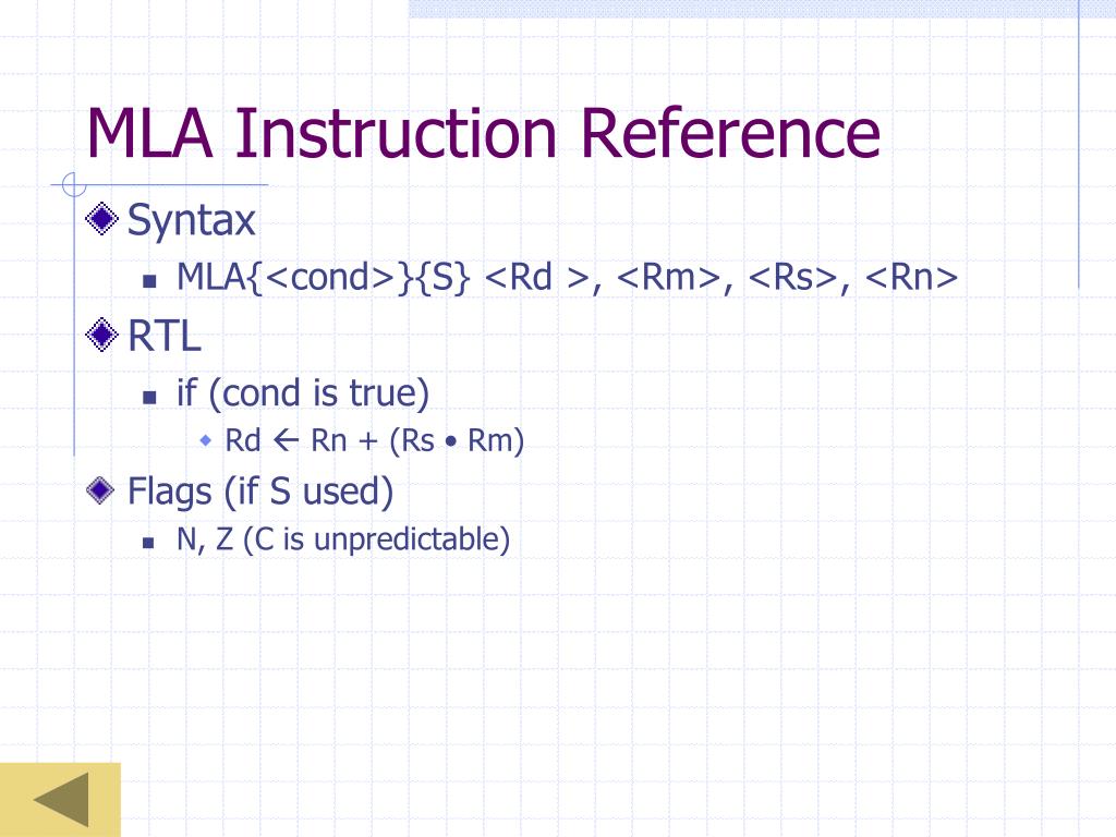 MLA Instruction Reference • Syntax • MLA{<cond>}{S} <Rd >, <Rm>, <Rs>, <Rn> • RTL • if (cond is true) • Rd Rn + (Rs • Rm) • Flags (if S used) • N, Z (C is unpredictable)