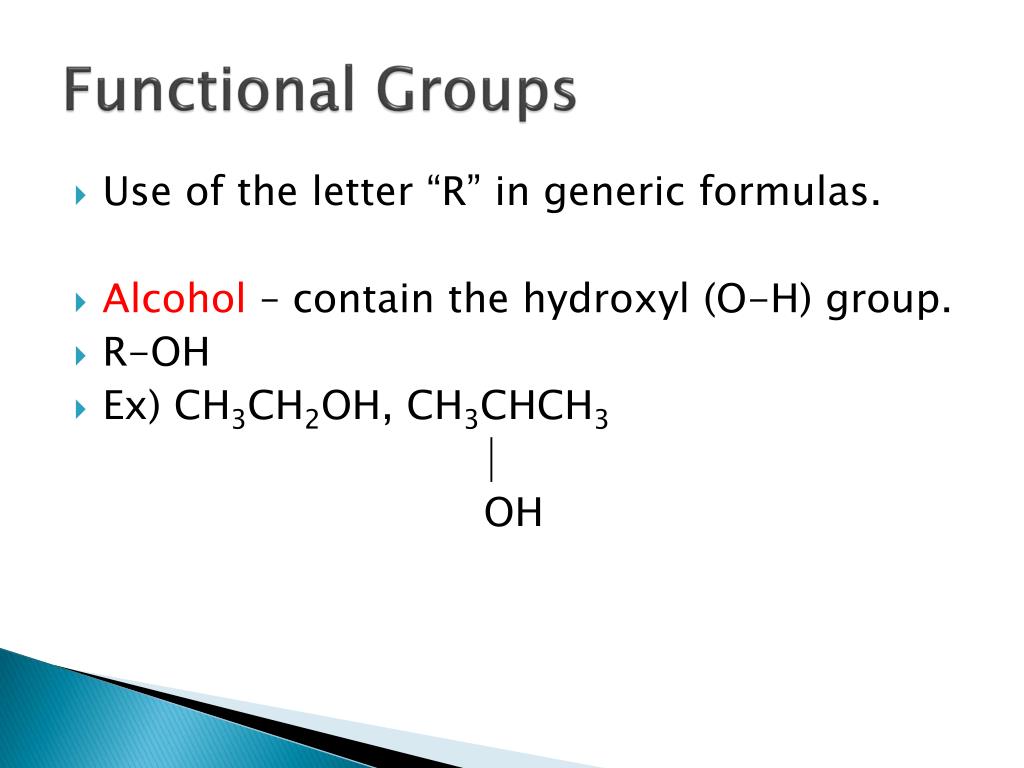 Functional Groups • Use of the letter “R” in generic formulas. • Alcohol – contain the hydroxyl (O-H) group. • R-OH • Ex) CH3CH2OH, CH3CHCH3 OH