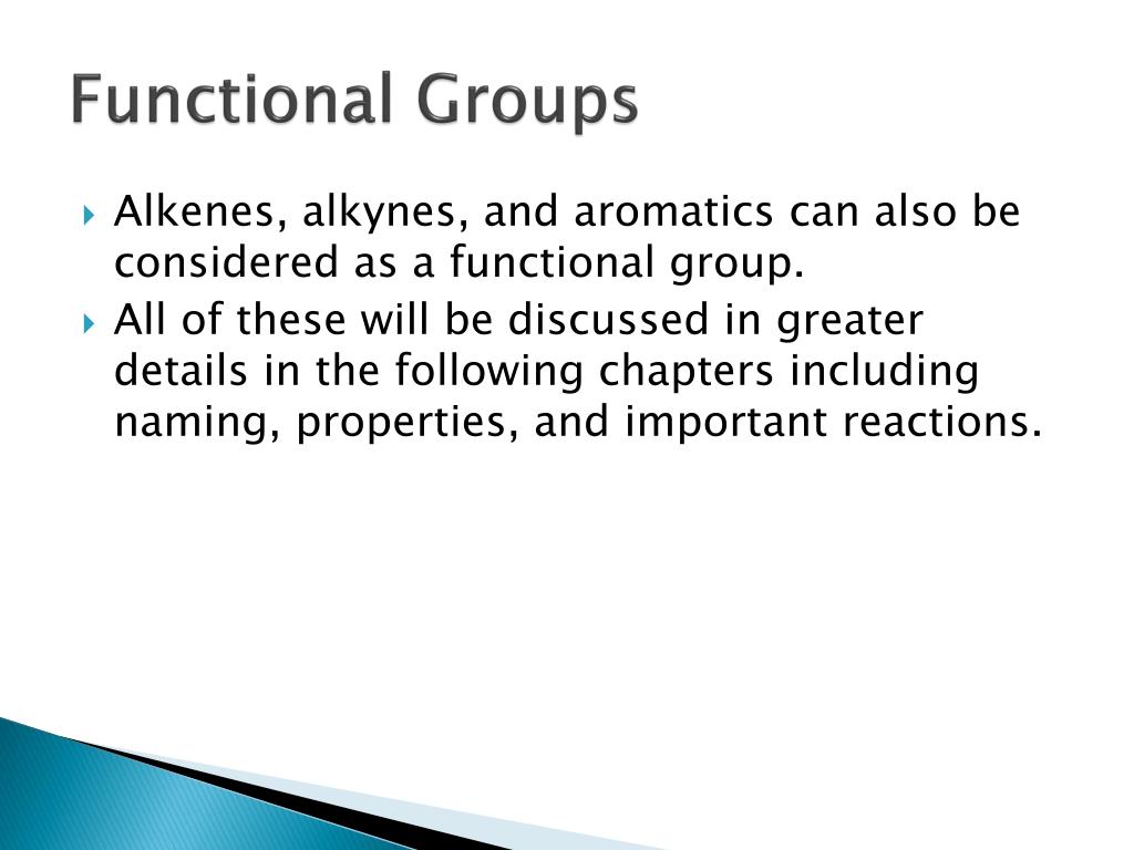 Functional Groups • Alkenes, alkynes, and aromatics can also be considered as a functional group. • All of these will be discussed in greater details in the following chapters including naming, properties, and important reactions.