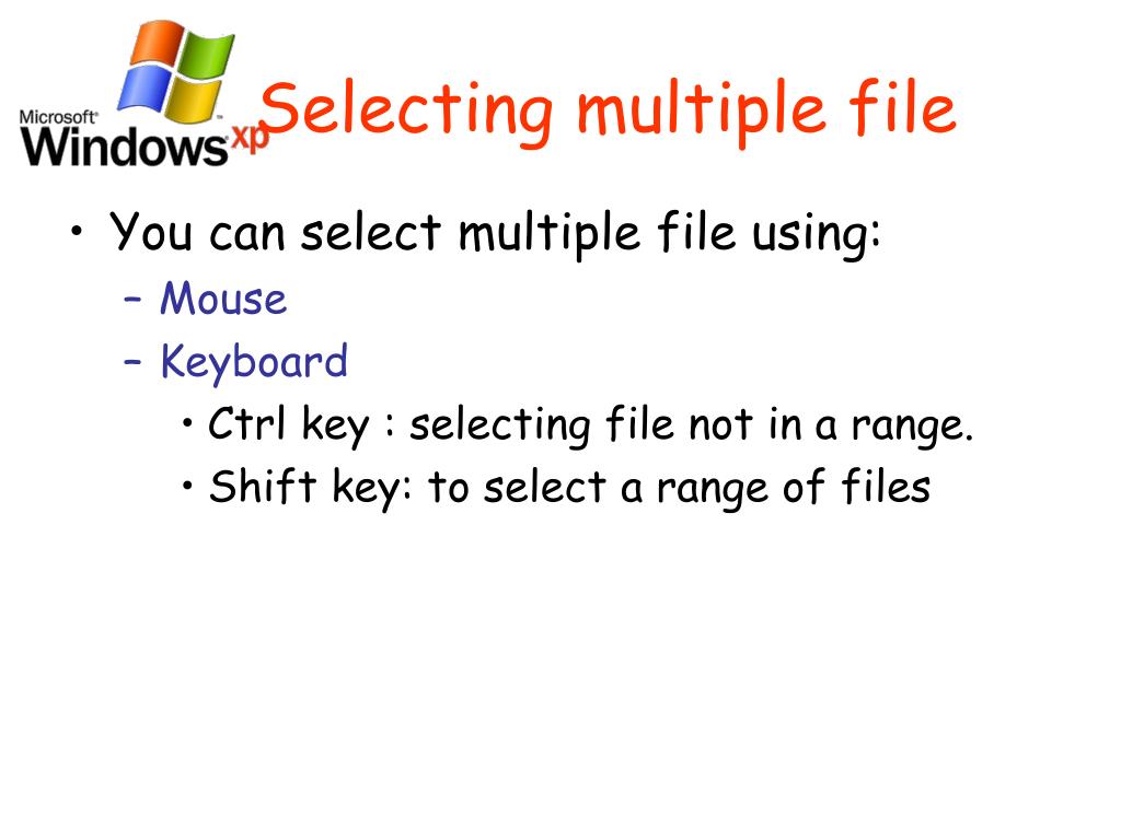 Selecting multiple file • You can select multiple file using: • Mouse • Keyboard • Ctrl key : selecting file not in a range. • Shift key: to select a range of files