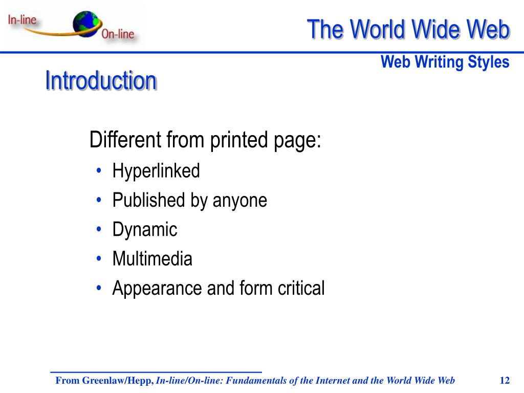 Web Writing Styles Introduction • Different from printed page: • Hyperlinked • Published by anyone • Dynamic • Multimedia • Appearance and form critical From Greenlaw/Hepp, In-line/On-line: Fundamentals of the Internet and the World Wide Web