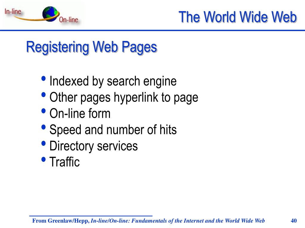 Registering Web Pages Indexed by search engine Other pages hyperlink to page On-line form Speed and number of hits Directory services Traffic From Greenlaw/Hepp, In-line/On-line: Fundamentals of the Internet and the World Wide Web
