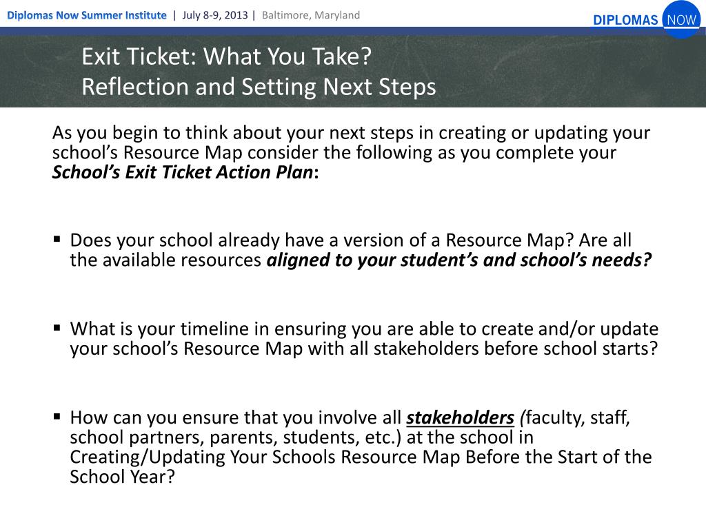 Exit Ticket: What You Take?Reflection and Setting Next Steps As you begin to think about your next steps in creating or updating your school’s Resource Map consider the following as you complete your School’s Exit Ticket Action Plan: • Does your school already have a version of a Resource Map? Are all the available resources aligned to your student’s and school’s needs? • What is your timeline in ensuring you are able to create and/or update your school’s Resource Map with all stakeholders before school starts? • How can you ensure that you involve all stakeholders (faculty, staff, school partners, parents, students, etc.) at the school in Creating/Updating Your Schools Resource Map Before the Start of the School Year?