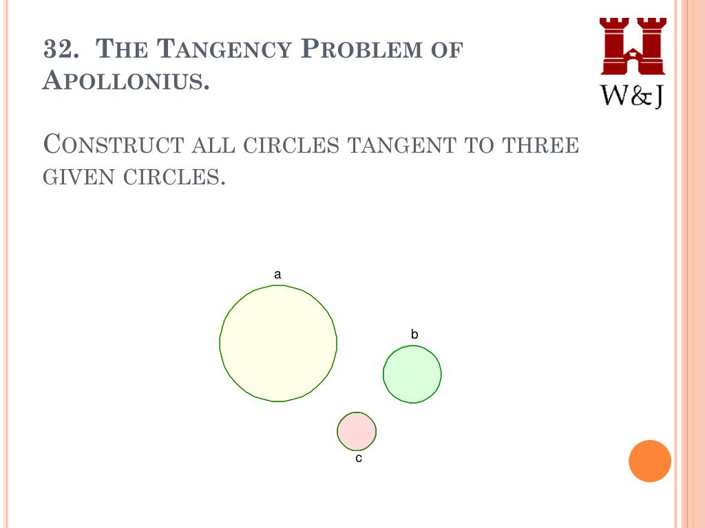 32. The Tangency Problem of Apollonius.Construct all circles tangent to three given circles.