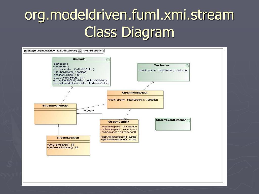 org.modeldriven.fuml.xmi.stream • StAX (stream) pull-parser • Flexible – event based and stream based • Efficient – only read events you want • External XMI imports • Internal/External Library imports