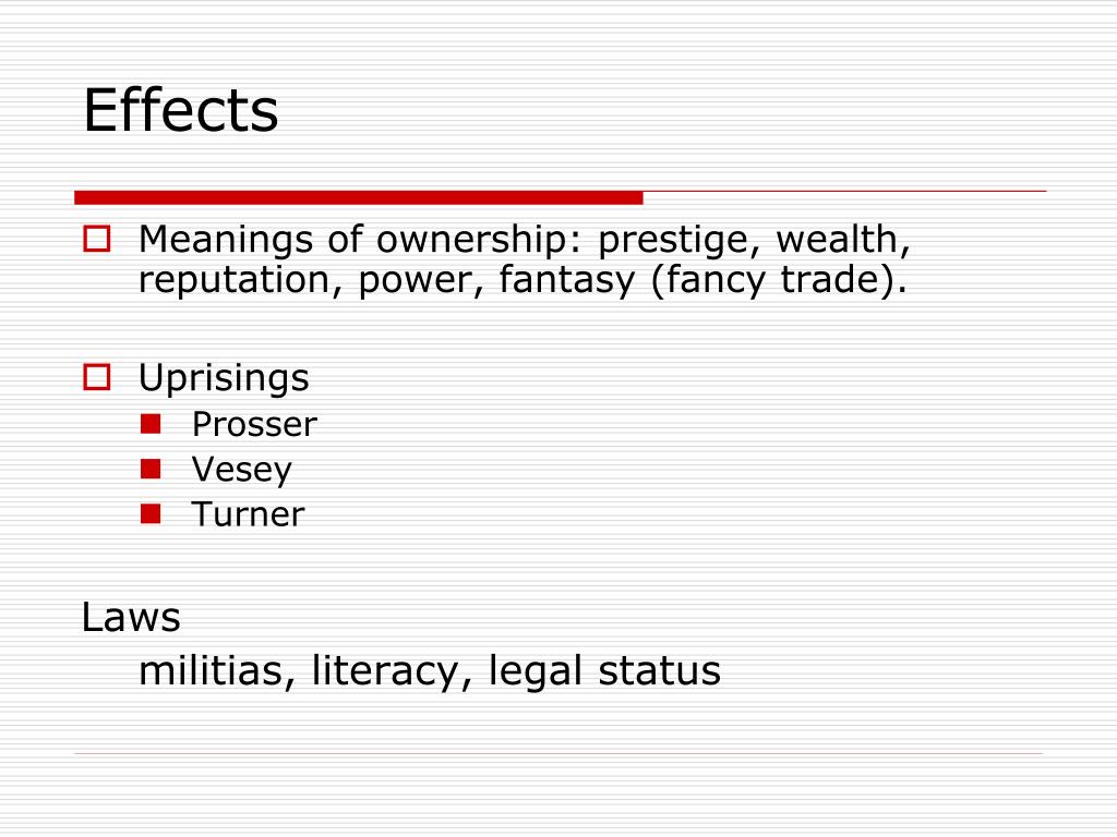 Effects • Meanings of ownership: prestige, wealth, reputation, power, fantasy (fancy trade). • Uprisings • Prosser • Vesey • Turner Laws militias, literacy, legal status