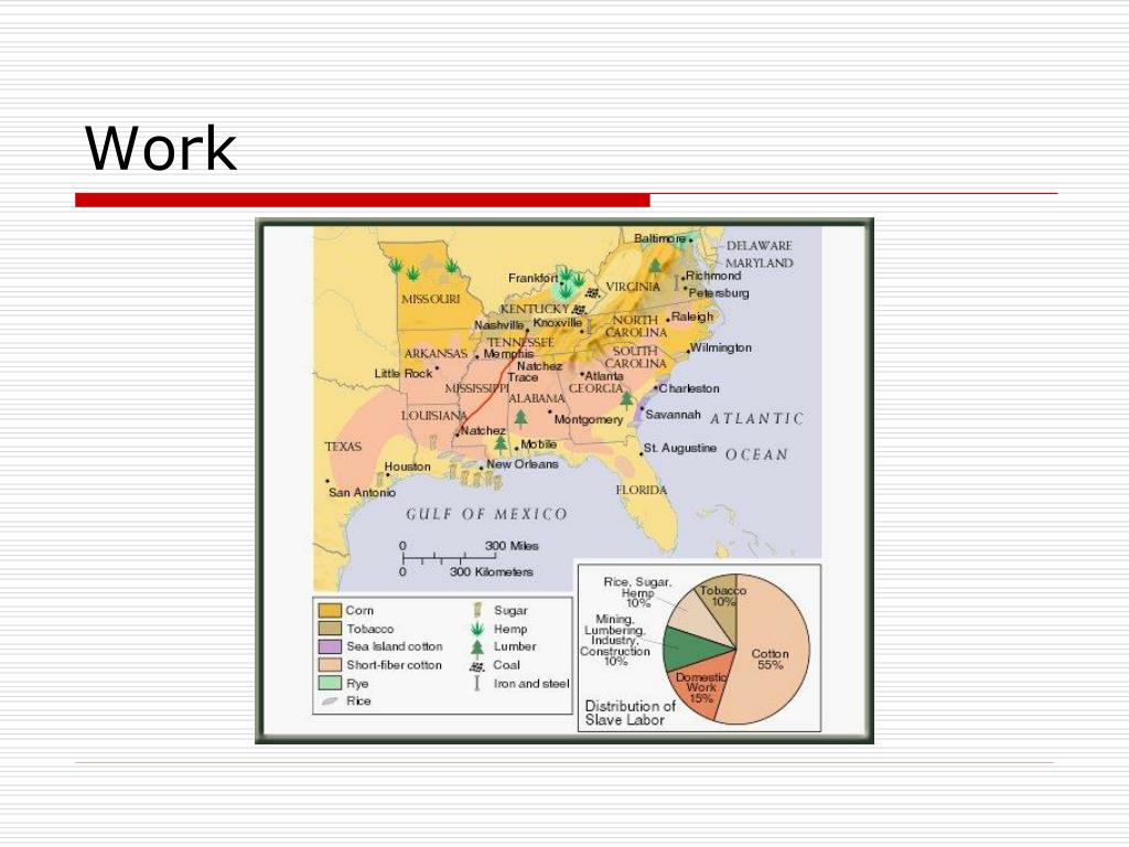 Internal Slave Trade • The Chesapeake transition from buyer to seller: “Sold down the river” • 1790-1810: some 90,000 slaves were sold out or moved with masters from the Chesapeake region to Kentucky, Tennessee, and points south. • 1810 –1820: another 124,000 slaves were forced to move • 1830-1860: more than 10,000 per year. • Demand in the deep South • Slave work: fields, mills, ditches, fences, drivers, stevedores, cooks, gardeners, servants, coachmen, grooms, blacksmiths, carpenters, etc.