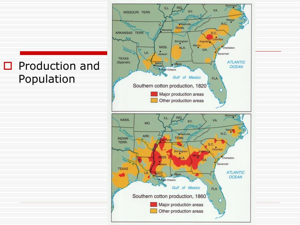 The Cotton Kingdom • U.S. Expansion • From 1790-1800: VT, KY, TN, • From 1800-1820: OH, LA, IN, MS, IL, AL, ME, MO. • Louisiana Purchase • War of 1812 • Indian Treaties, Indian Removal