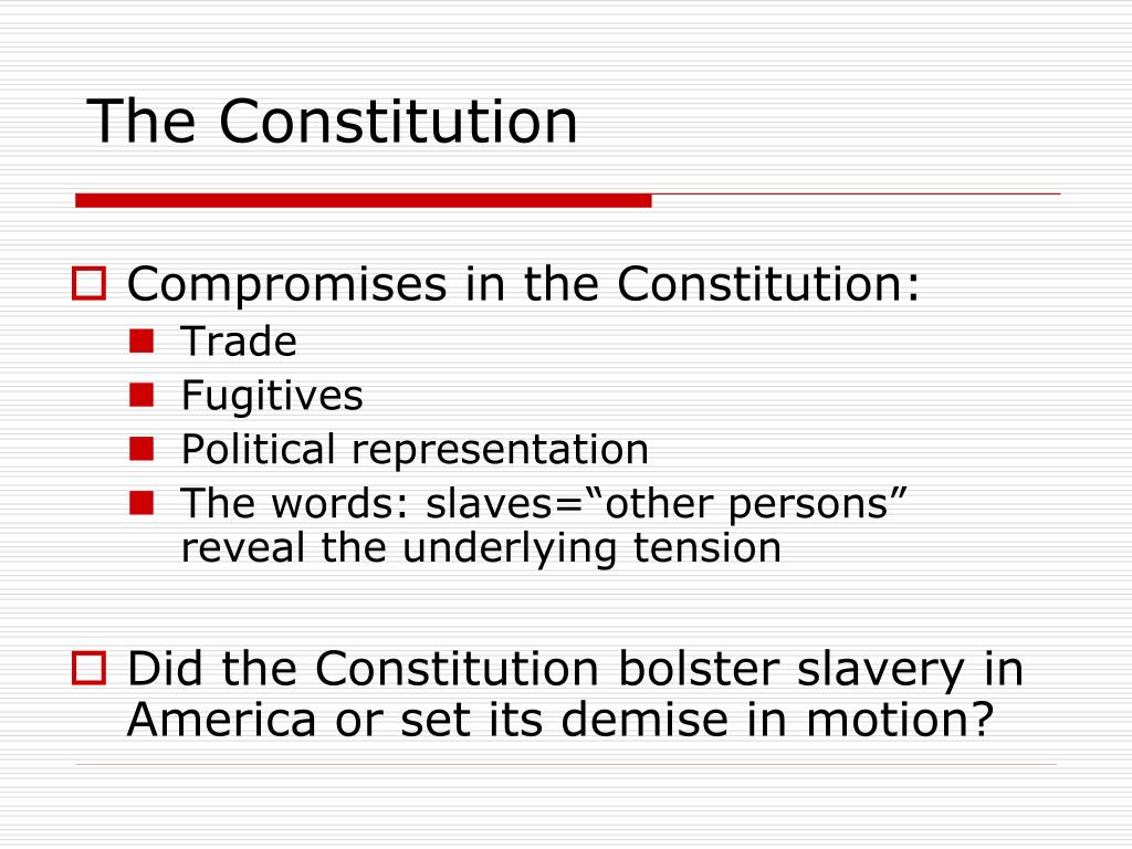 The Constitution • Compromises in the Constitution: • Trade • Fugitives • Political representation • The words: slaves=“other persons” reveal the underlying tension • Did the Constitution bolster slavery in America or set its demise in motion?