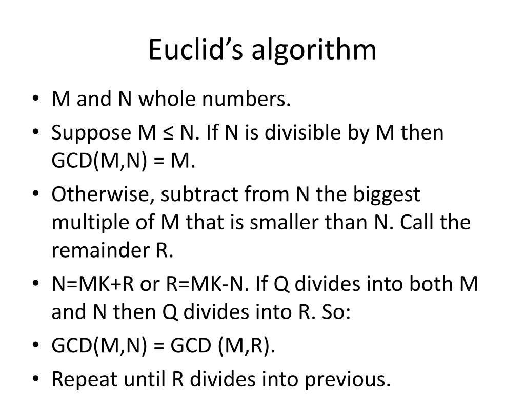 Euclid’s algorithm M and N whole numbers. Suppose M ≤ N. If N is divisible by M then GCD(M,N) = M. Otherwise, subtract from N the biggest multiple of M that is smaller than N. Call the remainder R. N=MK+R or R=MK-N. If Q divides into both M and N then Q divides into R. So: GCD(M,N) = GCD (M,R). Repeat until R divides into previous.