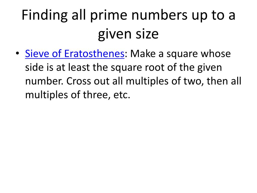 Finding all prime numbers up to a given size • Sieve of Eratosthenes: Make a square whose side is at least the square root of the given number. Cross out all multiples of two, then all multiples of three, etc.