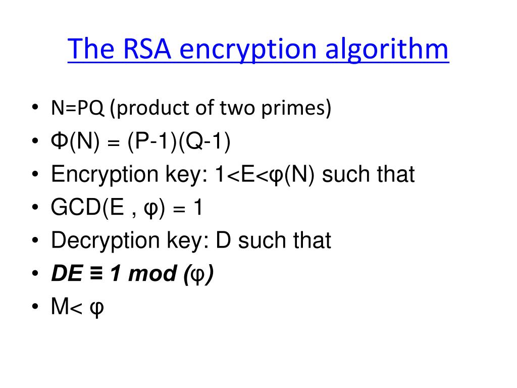 The RSA encryption algorithm • N=PQ (product of two primes) • Φ(N) = (P-1)(Q-1) • Encryption key: 1<E<φ(N) such that • GCD(E , φ) = 1 • Decryption key: D such that • DE ≡ 1 mod (φ) • M< φ