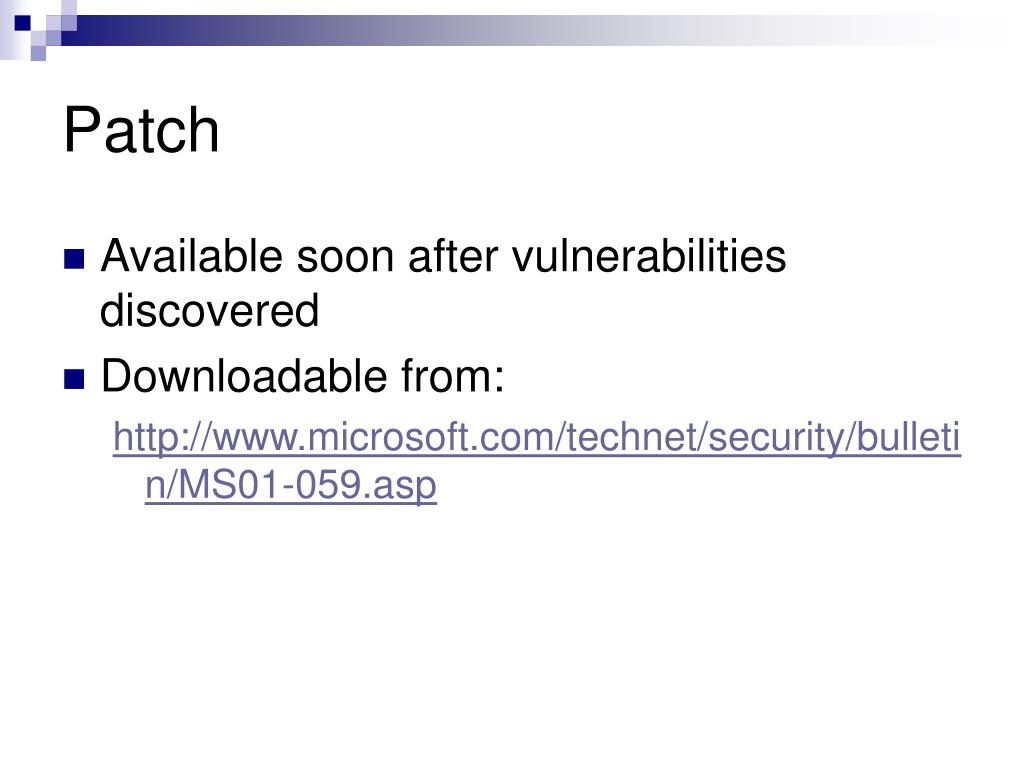 Patch • Available soon after vulnerabilities discovered • Downloadable from: http://www.microsoft.com/technet/security/bulletin/MS01-059.asp