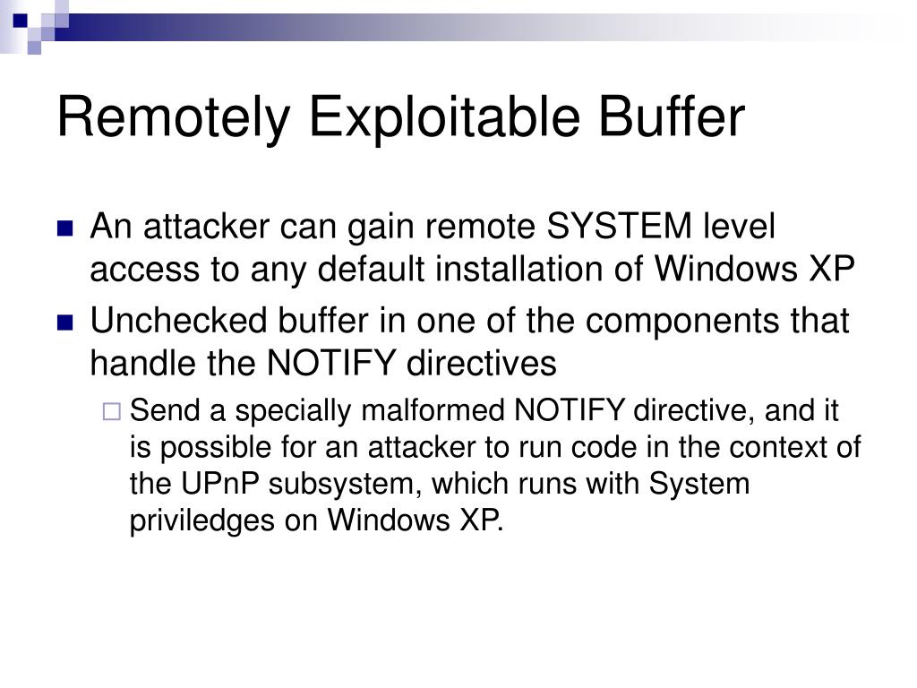 Remotely Exploitable Buffer • An attacker can gain remote SYSTEM level access to any default installation of Windows XP • Unchecked buffer in one of the components that handle the NOTIFY directives • Send a specially malformed NOTIFY directive, and it is possible for an attacker to run code in the context of the UPnP subsystem, which runs with System priviledges on Windows XP.