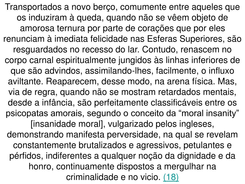 Transportados a novo berço, comumente entre aqueles que os induziram à queda, quando não se vêem objeto de amorosa ternura por parte de corações que por eles renunciam à imediata felicidade nas Esferas Superiores, são resguardados no recesso do lar. Contudo, renascem no corpo carnal espiritualmente jungidos às linhas inferiores de que são advindos, assimilando-lhes, facilmente, o influxo aviltante. Reaparecem, desse modo, na arena física. Mas, via de regra, quando não se mostram retardados mentais, desde a infância, são perfeitamente classificáveis entre os psicopatas amorais, segundo o conceito da “moral insanity” [insanidade moral], vulgarizado pelos ingleses, demonstrando manifesta perversidade, na qual se revelam constantemente brutalizados e agressivos, petulantes e pérfidos, indiferentes a qualquer noção da dignidade e da honro, continuamente dispostos a mergulhar na criminalidade e no vicio. (18)