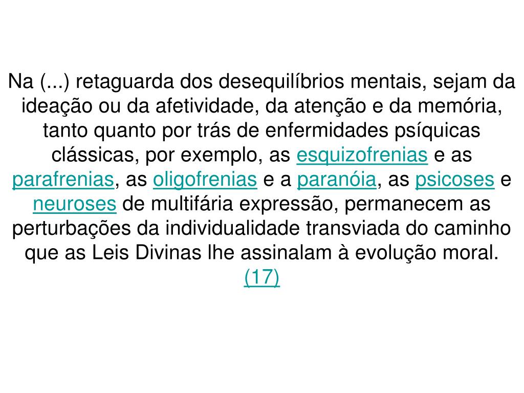 Na (...) retaguarda dos desequilíbrios mentais, sejam da ideação ou da afetividade, da atenção e da memória, tanto quanto por trás de enfermidades psíquicas clássicas, por exemplo, as esquizofrenias e as parafrenias, as oligofrenias e a paranóia, as psicoses e neuroses de multifária expressão, permanecem as perturbações da individualidade transviada do caminho que as Leis Divinas lhe assinalam à evolução moral. (17)