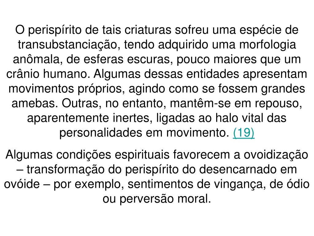 O perispírito de tais criaturas sofreu uma espécie de transubstanciação, tendo adquirido uma morfologia anômala, de esferas escuras, pouco maiores que um crânio humano. Algumas dessas entidades apresentam movimentos próprios, agindo como se fossem grandes amebas. Outras, no entanto, mantêm-se em repouso, aparentemente inertes, ligadas ao halo vital das personalidades em movimento. (19) Algumas condições espirituais favorecem a ovoidização – transformação do perispírito do desencarnado em ovóide – por exemplo, sentimentos de vingança, de ódio ou perversão moral.
