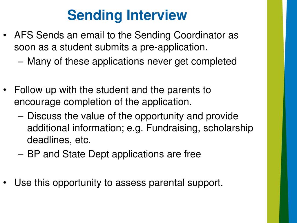 Sending Interview • AFS Sends an email to the Sending Coordinator as soon as a student submits a pre-application. • Many of these applications never get completed • Follow up with the student and the parents to encourage completion of the application. • Discuss the value of the opportunity and provide additional information; e.g. Fundraising, scholarship deadlines, etc. • BP and State Dept applications are free • Use this opportunity to assess parental support.