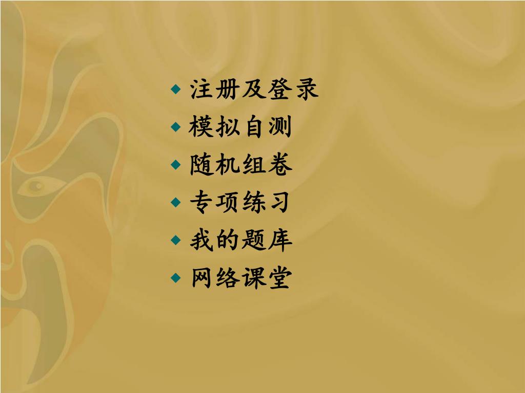注册及登录 • 模拟自测 • 随机组卷 • 专项练习 • 我的题库 • 网络课堂