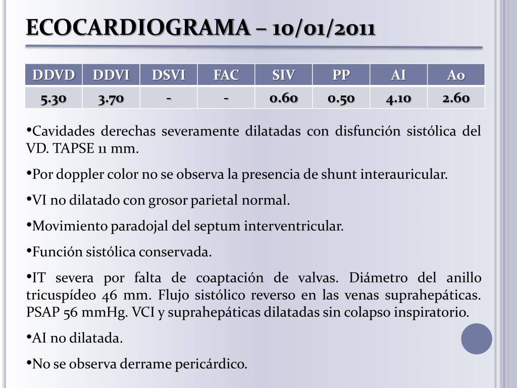 ECOCARDIOGRAMA – 10/01/2011 • Cavidades derechas severamente dilatadas con disfunción sistólica del VD. TAPSE 11 mm. • Por doppler color no se observa la presencia de shunt interauricular. • VI no dilatado con grosor parietal normal. • Movimiento paradojal del septum interventricular. • Función sistólica conservada. • IT severa por falta de coaptación de valvas. Diámetro del anillo tricuspídeo 46 mm. Flujo sistólico reverso en las venas suprahepáticas. PSAP 56 mmHg. VCI y suprahepáticas dilatadas sin colapso inspiratorio. • AI no dilatada. • No se observa derrame pericárdico.