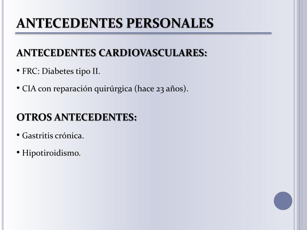 ANTECEDENTES PERSONALES • ANTECEDENTES CARDIOVASCULARES: • FRC: Diabetes tipo II. • CIA con reparación quirúrgica (hace 23 años). • OTROS ANTECEDENTES: • Gastritis crónica. • Hipotiroidismo.