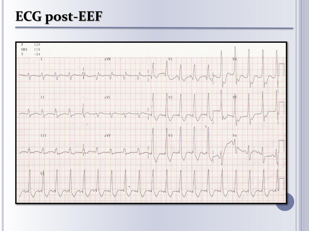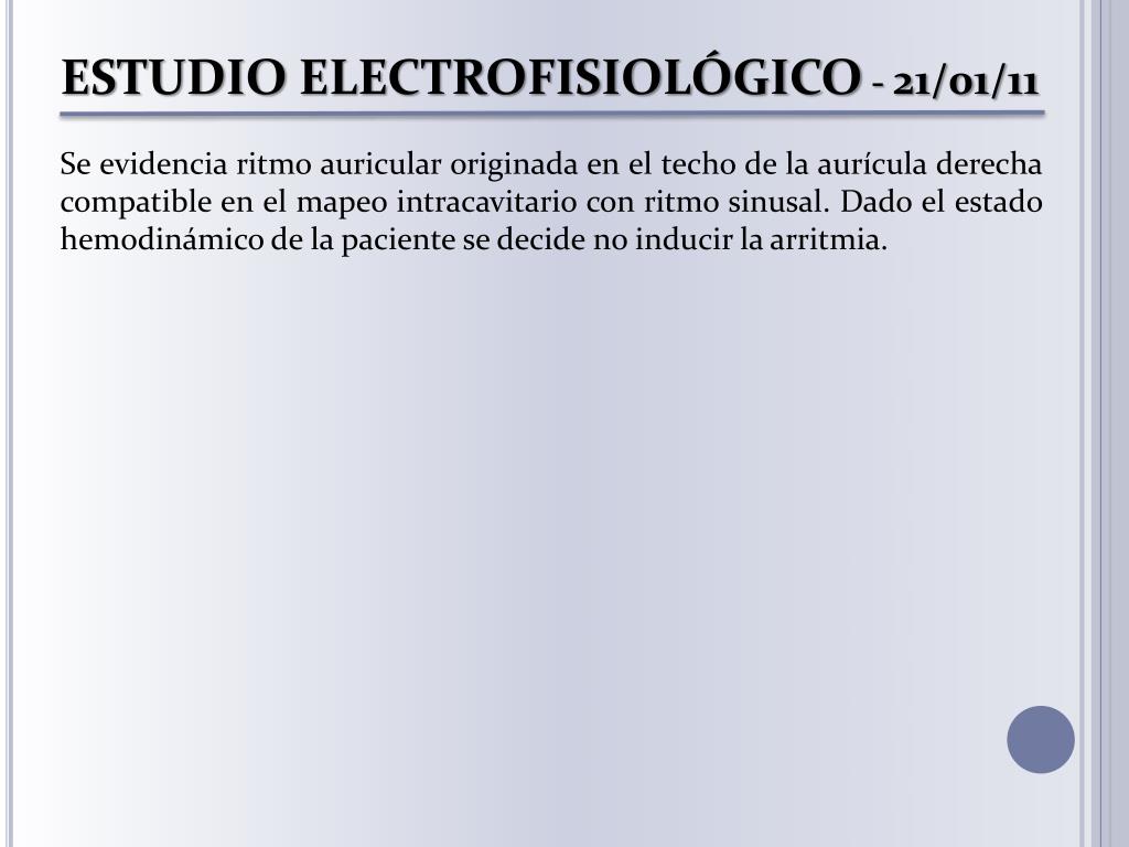 ESTUDIO ELECTROFISIOLÓGICO - 21/01/11 Se evidencia ritmo auricular originada en el techo de la aurícula derecha compatible en el mapeo intracavitario con ritmo sinusal. Dado el estado hemodinámico de la paciente se decide no inducir la arritmia.