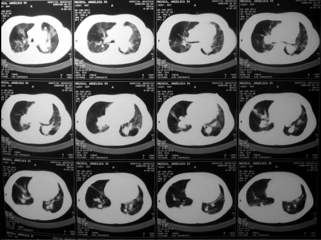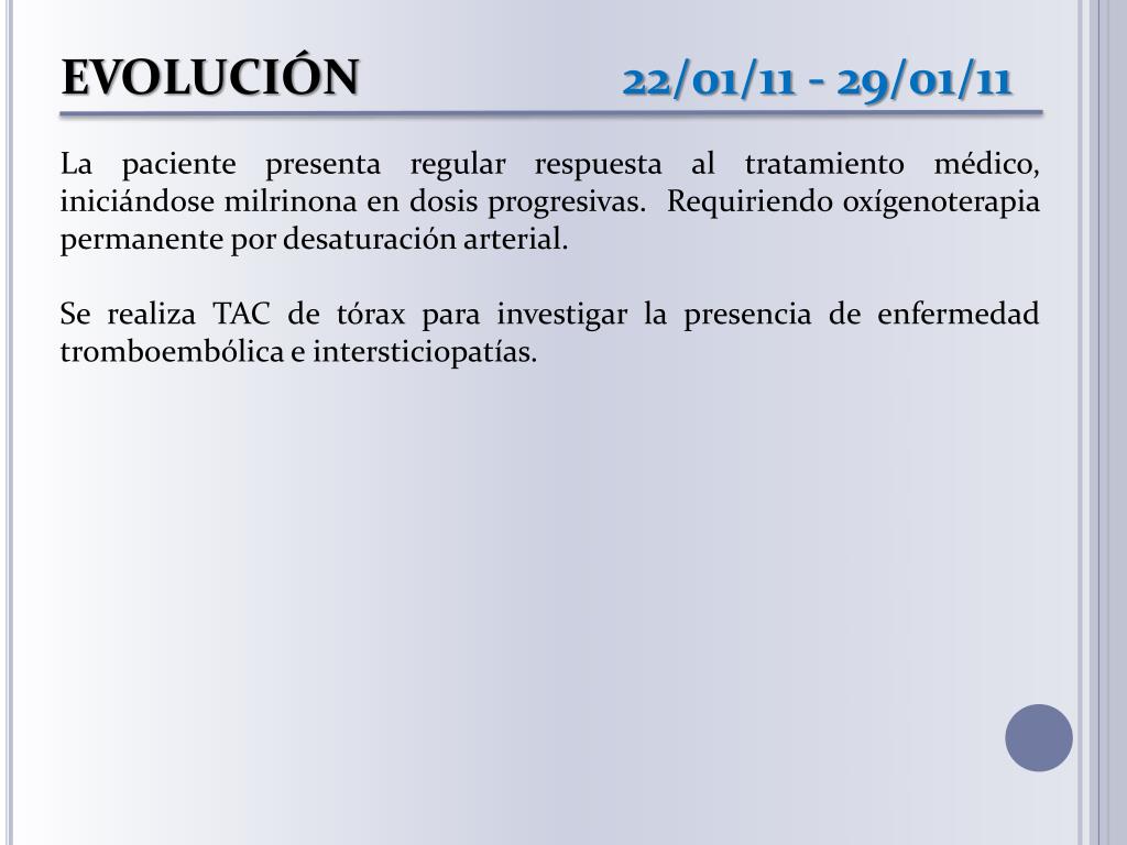 EVOLUCIÓN 22/01/11 - 29/01/11 La paciente presenta regular respuesta al tratamiento médico, iniciándose milrinona en dosis progresivas. Requiriendo oxígenoterapia permanente por desaturación arterial. Se realiza TAC de tórax para investigar la presencia de enfermedad tromboembólica e intersticiopatías.