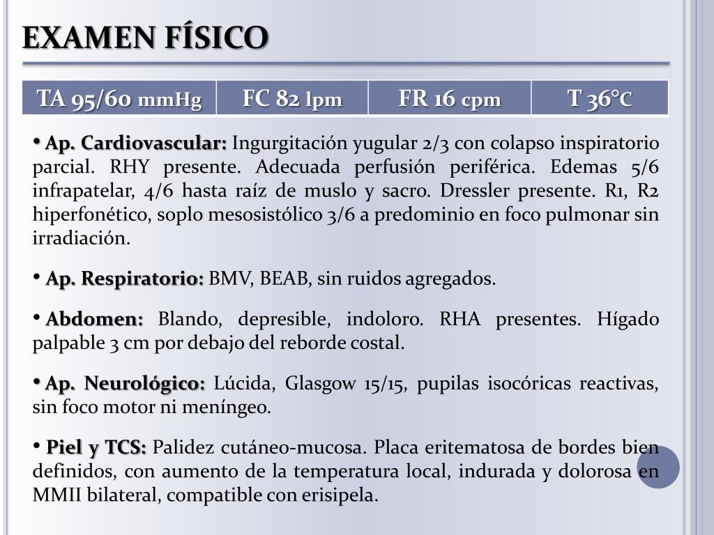 EXAMEN FÍSICO • Ap. Cardiovascular: Ingurgitación yugular 2/3 con colapso inspiratorio parcial. RHY presente. Adecuada perfusión periférica. Edemas 5/6 infrapatelar, 4/6 hasta raíz de muslo y sacro. Dressler presente. R1, R2 hiperfonético, soplo mesosistólico 3/6 a predominio en foco pulmonar sin irradiación. • Ap. Respiratorio: BMV, BEAB, sin ruidos agregados. • Abdomen: Blando, depresible, indoloro. RHA presentes. Hígado palpable 3 cm por debajo del reborde costal. • Ap. Neurológico: Lúcida, Glasgow 15/15, pupilas isocóricas reactivas, sin foco motor ni meníngeo. • Piel y TCS: Palidez cutáneo-mucosa. Placa eritematosa de bordes bien definidos, con aumento de la temperatura local, indurada y dolorosa en MMII bilateral, compatible con erisipela.
