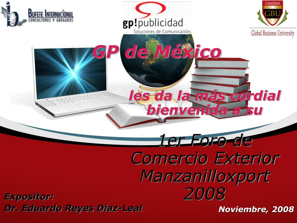 GP de México. les da la más cordial bienvenida a su 1er Foro de Comercio Exterior Manzanilloxport 2008. Expositor: Dr. Eduardo Reyes Díaz-Leal. Noviembre, 2008. 1er Foro de Comercio Exterior Manzanilloxport 2008. ¡La economía global, en dónde estamos, hacia dónde vamos y