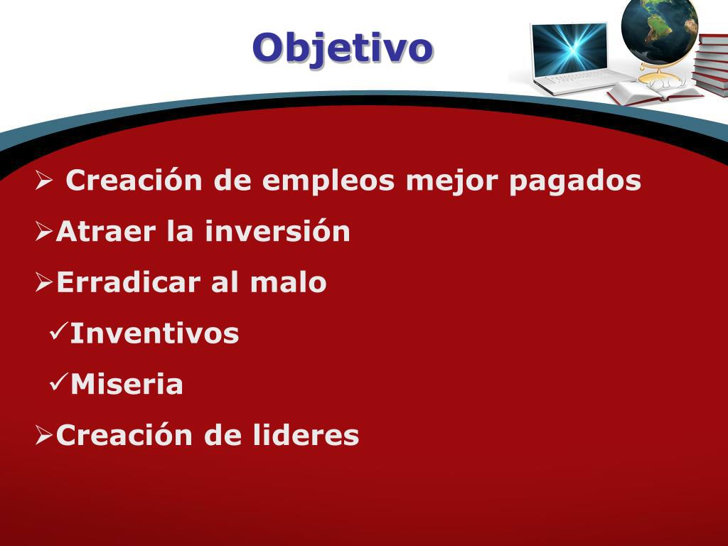 Objetivo • Creación de empleos mejor pagados • Atraer la inversión • Erradicar al malo • Inventivos • Miseria • Creación de lideres