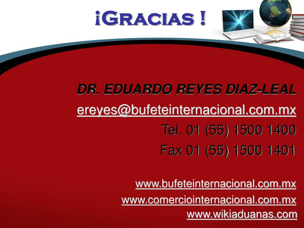 ¡Gracias ! DR. EDUARDO REYES DIAZ-LEAL ereyes@bufeteinternacional.com.mx Tel. 01 (55) 1500 1400 Fax 01 (55) 1500 1401 www.bufeteinternacional.com.mx www.comerciointernacional.com.mx www.wikiaduanas.com