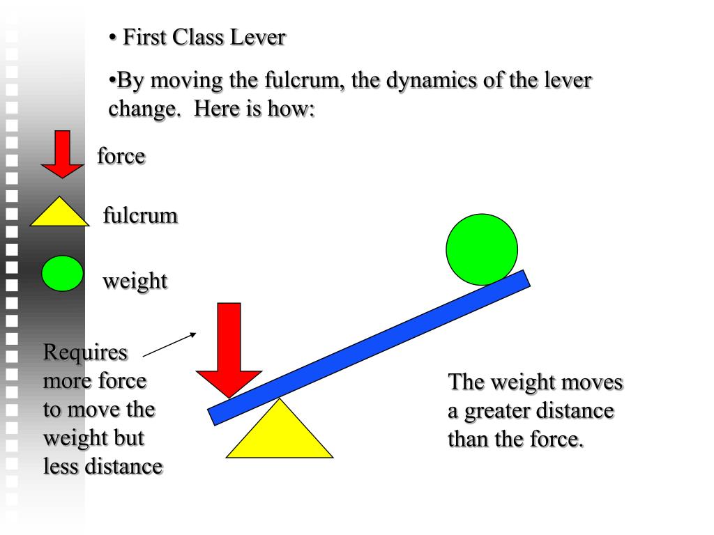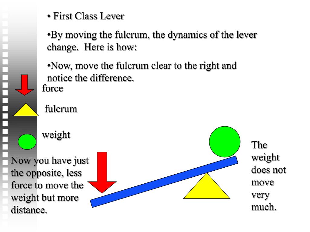 First Class Lever • By moving the fulcrum, the dynamics of the lever change. Here is how: force fulcrum weight Requires more force to move the weight but less distance The weight moves a greater distance than the force.