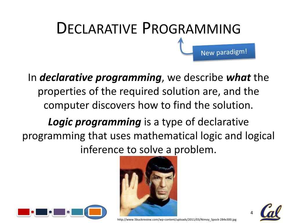 Declarative Programming New paradigm! In declarative programming, we describe what the properties of the required solution are, and the computer discovers how to find the solution. Logic programming is a type of declarative programming that uses mathematical logic and logical inference to solve a problem. http://www.5buckreview.com/wp-content/uploads/2011/03/Nimoy_Spock-284x300.jpg