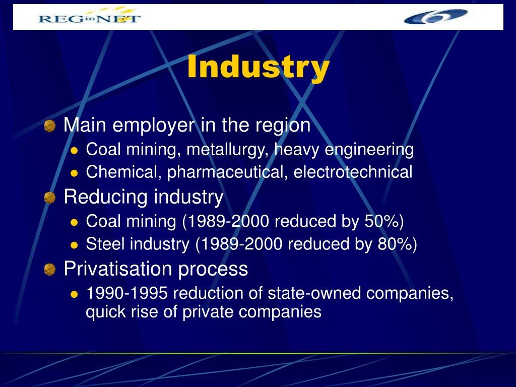 Industry • Main employer in the region • Coal mining, metallurgy, heavy engineering • Chemical, pharmaceutical, electrotechnical • Reducing industry • Coal mining (1989-2000 reduced by 50%) • Steel industry (1989-2000 reduced by 80%) • Privatisation process • 1990-1995 reduction of state-owned companies, quick rise of private companies